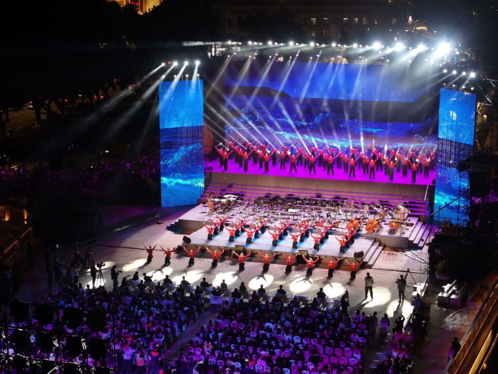 演出以交響合唱海峽組歌《直掛雲帆濟滄海》的八個章節為主線,創新性融入海峽舞集《六十八海里》中的舞蹈,形成歌、舞、樂相互交織的舞台呈現。整台作品既展現宏偉磅礴的史詩氣質,又彰顯細膩深情的藝術表達,營造出恢弘壯闊、兼具民族性與時代感的藝術風格。