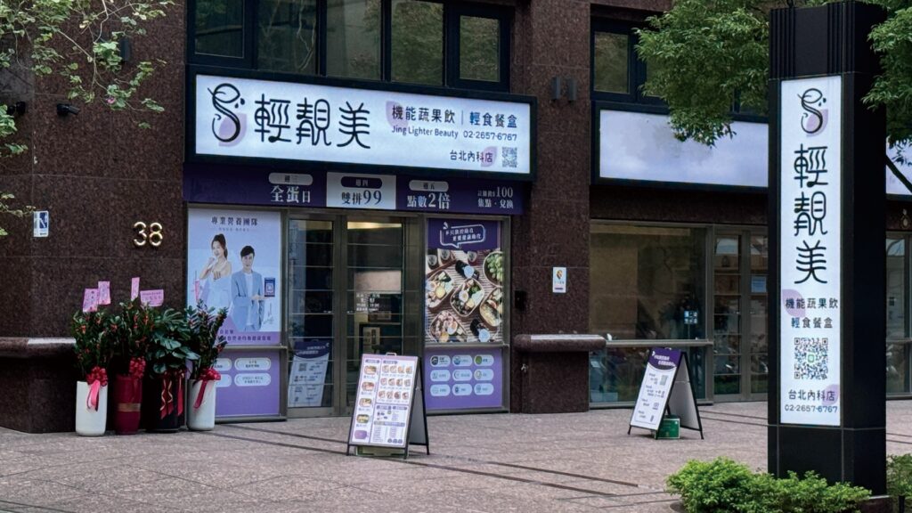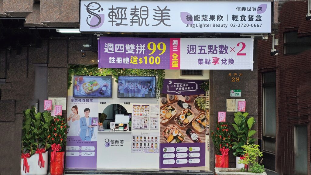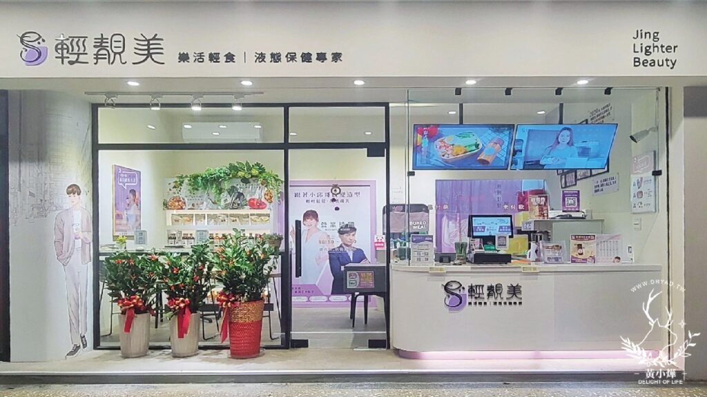 走進輕靚美門市,你會發覺這裡跟印象中的便當、餐盒店裝潢大相逕庭。整體設計採用大面積純白色調,搭配紫色點綴與綠植擺飾,打造出清新又富有質感的空間,給人一種專業且舒適的氛圍。店內放有代言人形象照,更顯創新獨特,讓人彷彿置身健康管理中心或美妝概念店,品牌特色鮮明。